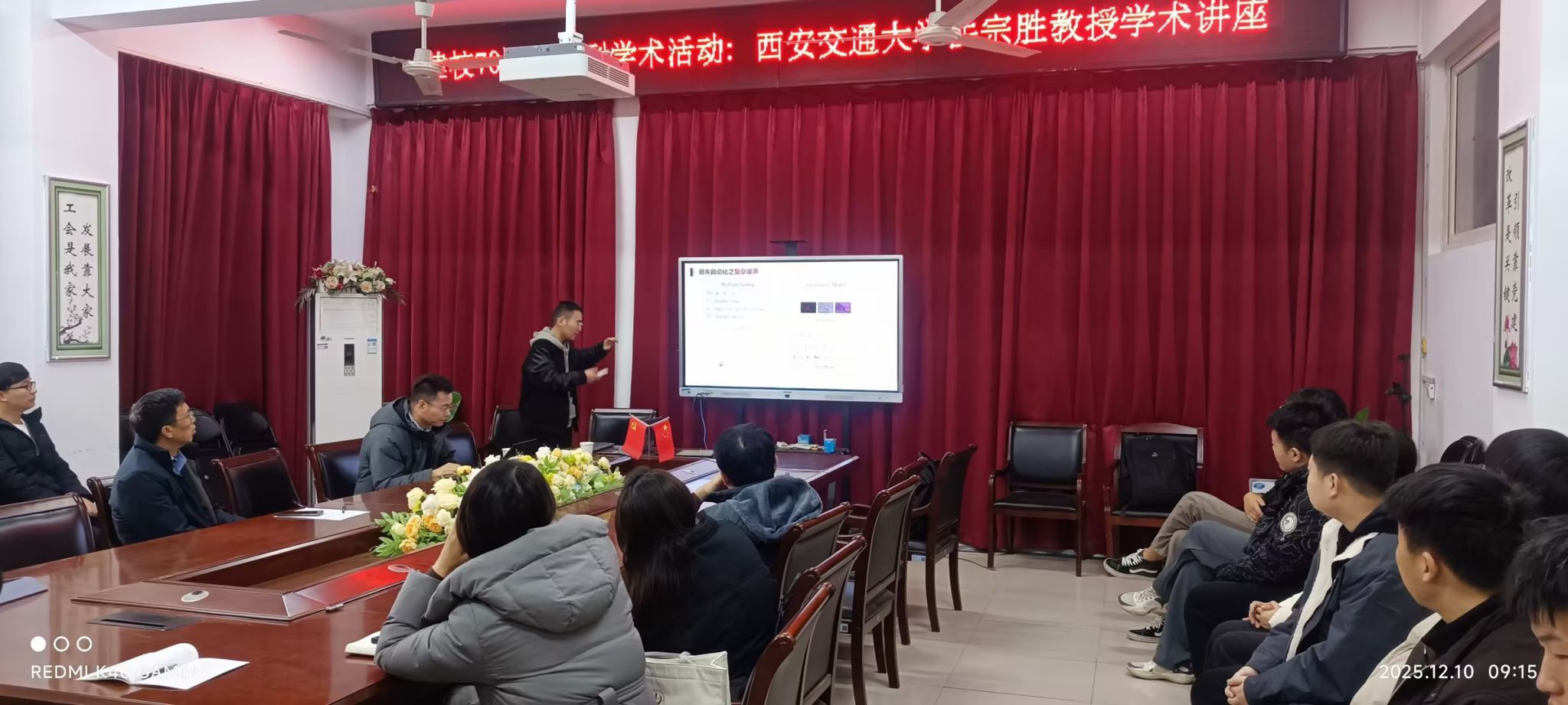 会上,岳宗胜围绕复杂场景下的图像复原这一核心主题展开深入讲解,同时分享了相关研究成果的落地应用情况,其团队成果已成功部署于华为旗舰手机影像系统,有效推动了AI智能影像增强技术在真实产品中的实践应用,让在场师生直观感受到学术研究的实用价值。报告内容兼具前沿性与实用性,逻辑严谨、案例翔实,深深吸引了在场师生。在互动环节中,参会师生与岳宗胜展开热烈交流,现场学术氛围十分浓厚。