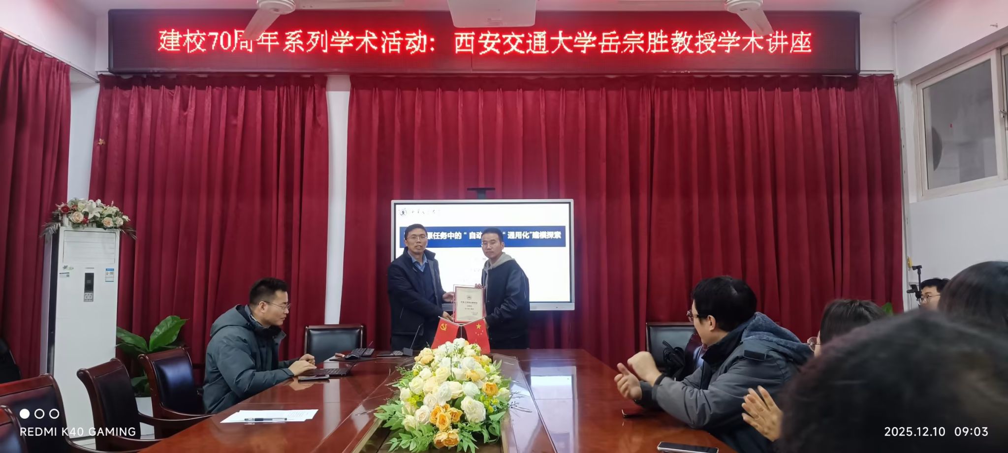 院长闫振亚主持。会前,闫振亚为岳宗胜颁发“弘德讲坛”主讲证书。